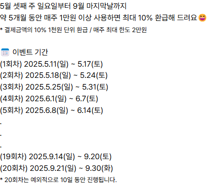 - 최소 결제금액: 회차별로 최소 1만 원 이상 결제해야 환급 대상이 됩니다.