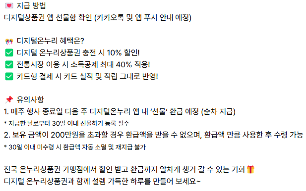 - 대상: 디지털 온누리상품권(모바일·카드형)으로 결제한 소비자