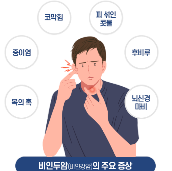 비인두암의 문제점 중 하나는 초기 증상이 뚜렷하지 않다는 점입니다. 그로 인해 비교적 진행된 상태에서 진단되는 경우가 많습니다. 아래는 흔히 관찰되는 증상들입니다: