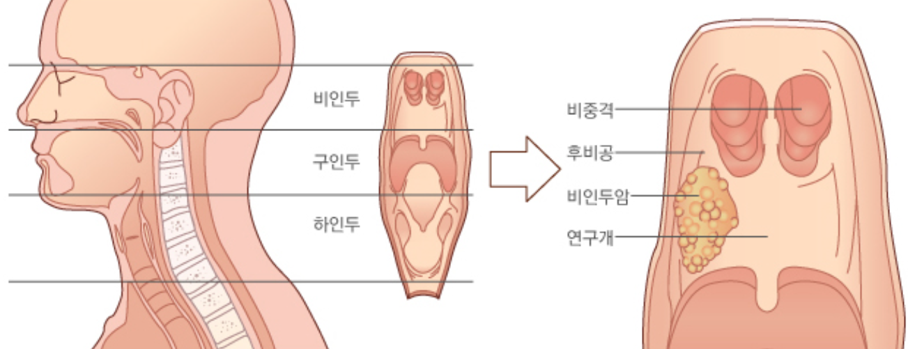 비인두암(Nasopharyngeal Cancer)은 코 뒤, 입천장 뒤쪽에서 인두의 윗부분에 해당하는 ‘비인두’ 부위에 생기는 악성종양입니다. 이 부위는 코·귀·뇌가 연결되는 복잡한 해부학 구조로, 종양이 생기면 다양한 증상이 나타날 수 있습니다. 특히 우리나라보다는 중국 남부나 동남아시아 지역에서 상대적으로 빈도가 높게 보고되고 있습니다.
