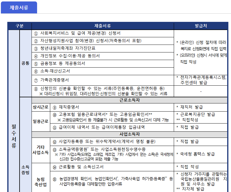 | 신청서 | 복지로 또는 읍면동 주민센터에서 양식 제공 |